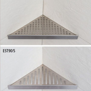 EST90 on ruostumattomasta teräksestä valmistettu kulmahylly, joka on helppo asentaa laatoituksen yhteydessä saumoihin ja näin ollen vältytään laattoihin poraamiselta. Siinä on kaunis, korkea etureunus, joka mahdollistaa myös hyllytason laatoittamisen halutessaan.